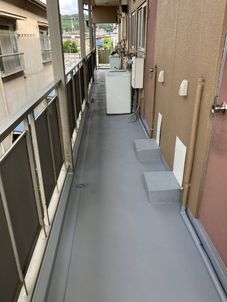 愛媛県松山市 🏢【アパート防水工事中】共用廊下の床をしっかり防水!長持ちリフォームで入居者も安心✨