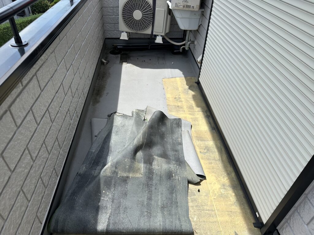 既存のベランダ防水は「シート防水」でしたが、経年劣化により端部のめくれや浮きが多数発生していました。