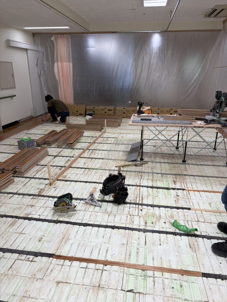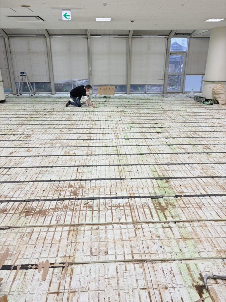 今回の現場は、広い室内空間の床全面張り替え工事です。