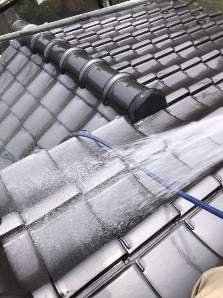 今回の現場は陶器瓦の屋根でした。一見きれいに見えても、瓦のズレや漆喰の劣化、下地防水シート(ルーフィング)の劣化が原因になるケースもあります。写真のように散水しながら、瓦の重なり部分や棟まわり、取り合い部分を重点的にチェックしました。瓦屋根は塗装しないから関係ない、ということはありません。外壁塗装の足場を組むタイミングは、屋根点検の絶好の機会です。