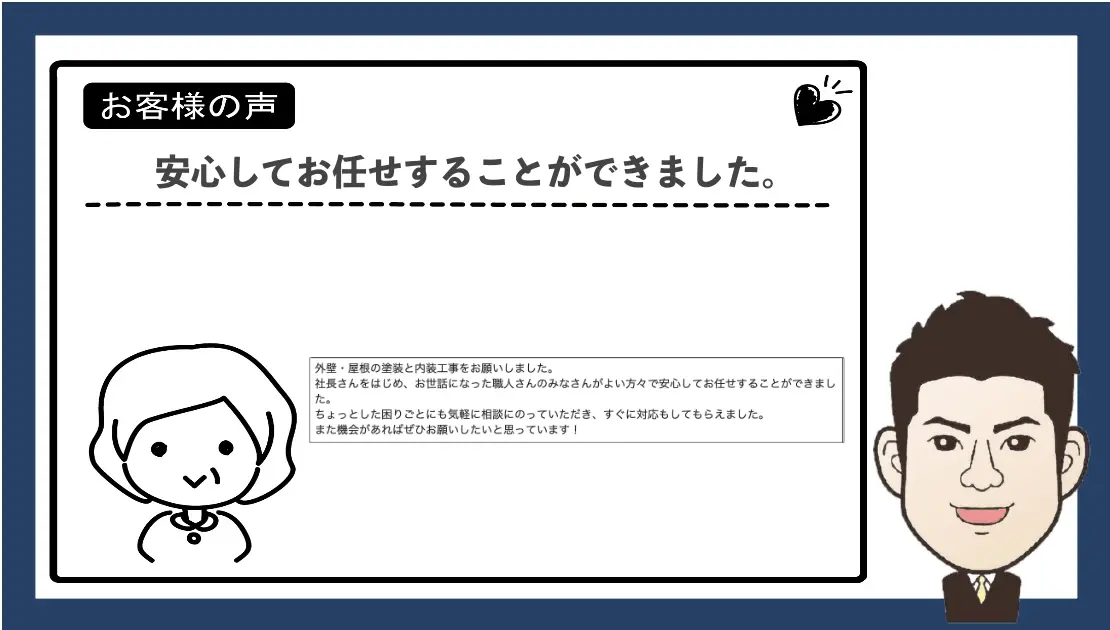 社長さんをはじめ、お世話になった職人さんのみなさんがよい方々で安心してお任せすることができました。